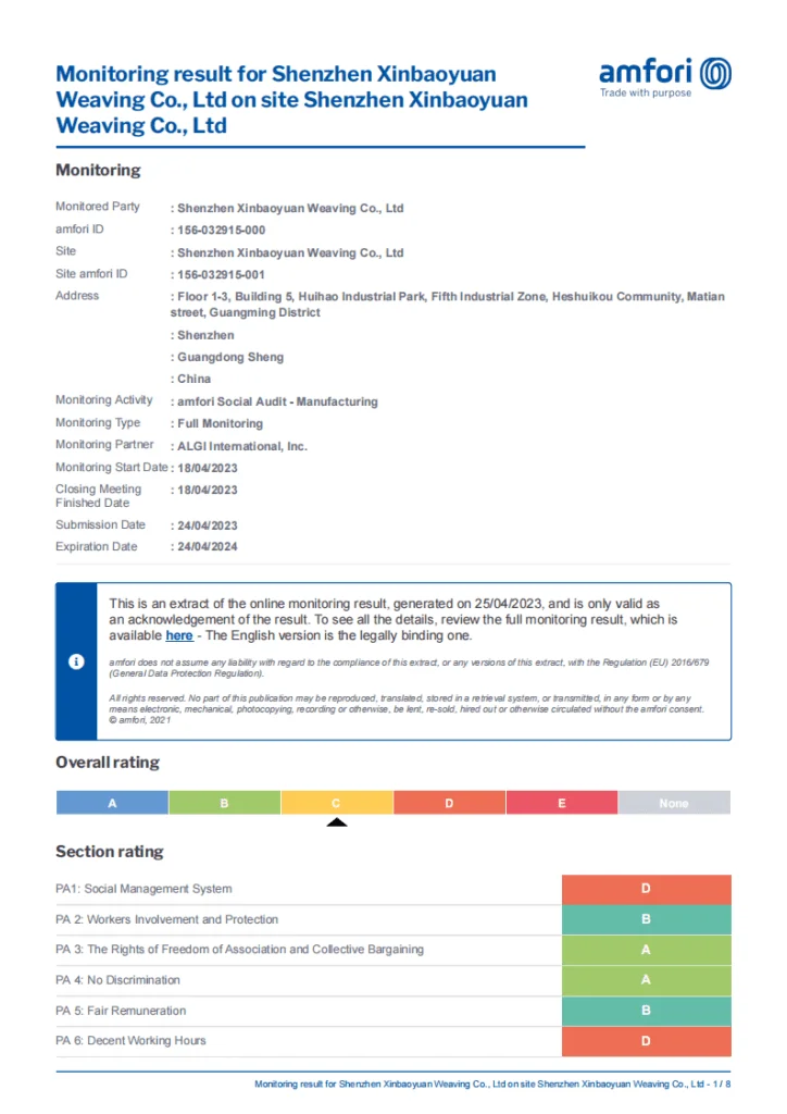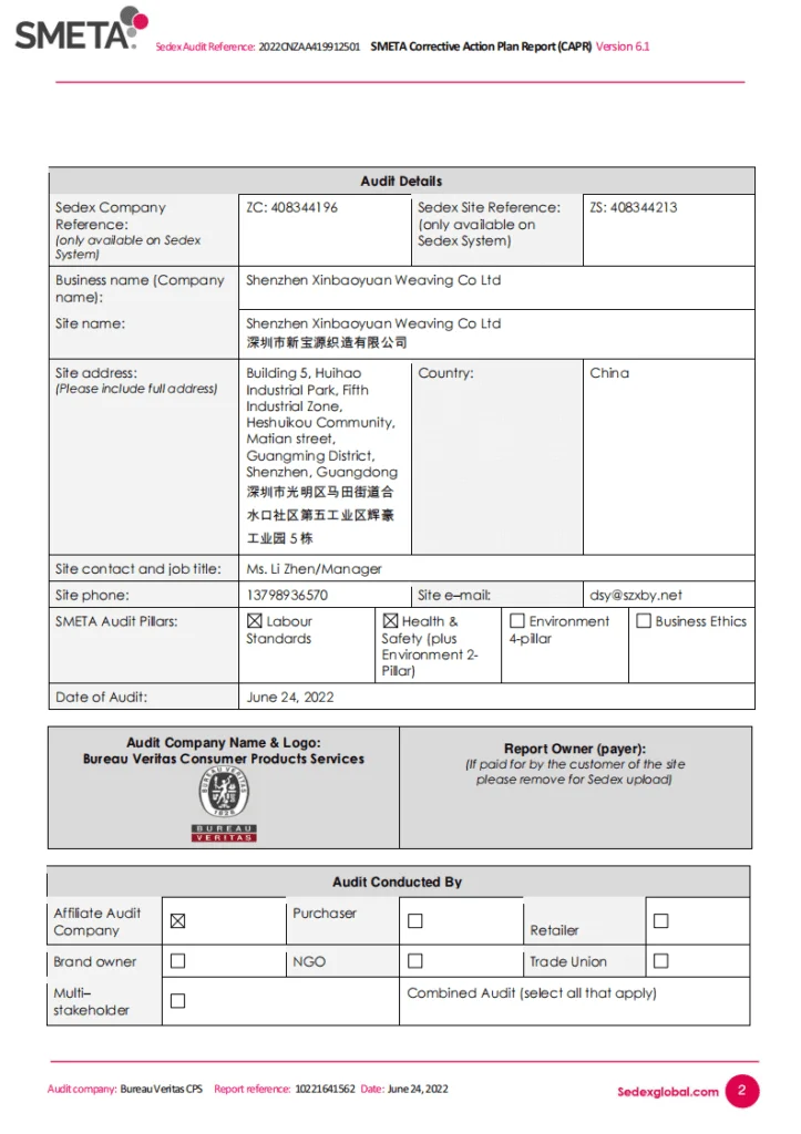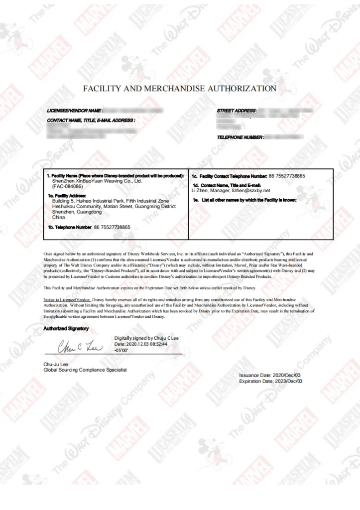 We have BSCI audit, Sedex audit, GRS certificate, OEKO-TEX certificate and FACILITY AND MERCHANDISE AUTHORIZATION from Disney.